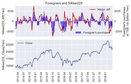 POINT 外国人投資家の売買動向による,日経平均株価への影響をPythonとExcelで可視化した. 週刊ダイヤモンドの図(3ヶ月単位)の再現に加え,1週間単位,1ヶ月単位でもプロットした. JPXで提供しているデータの最小単位である「1週間」のプロットでも,日…