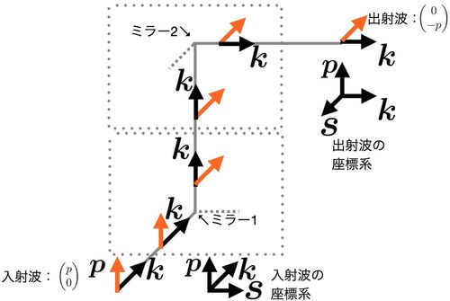 POINT ミラーの反射による偏光の変化をジョーンズベクトル・行列で計算する方法のメモ. 座標系の取り方は参考文献[1]に従う. 2つのミラー 図示による方法 ジョーンズベクトルとジョーンズ行列を使う方法 補足:ミラー間の座標回転角度の求め方 参考文献 2…